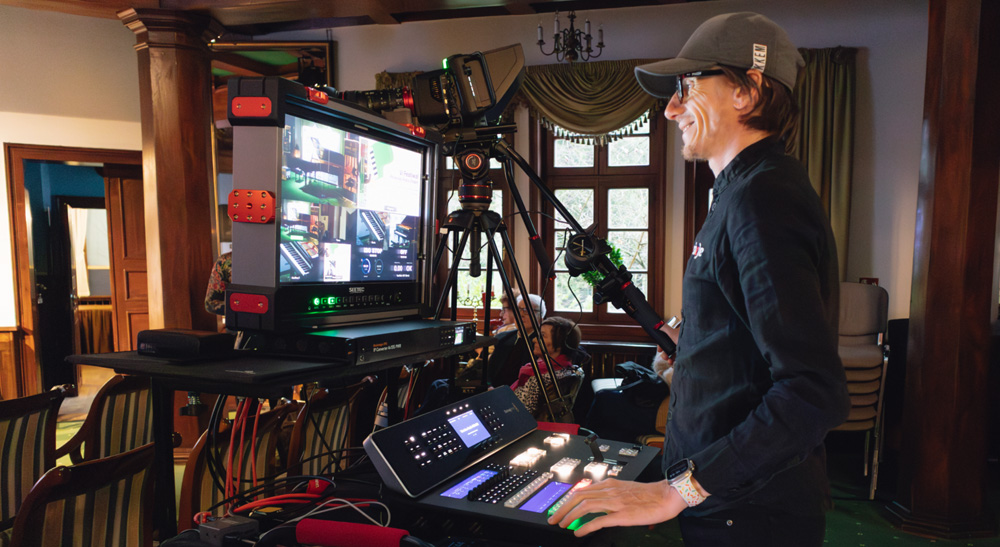 En el control central, se empleó un mezclador ATEM Television Studio HD8 ISO para alternar las imágenes en directo y grabar de manera simultánea la señal de cada cámara en archivos H.264 de menor resolución, junto con un archivo de proyecto de DaVinci Resolve. La dinámica de trabajo a través del protocolo de Internet (IP) posibilitó la gestión remota de las cámaras, lo que permitió modificar el enfoque, el encuadre y la exposición en tiempo real.