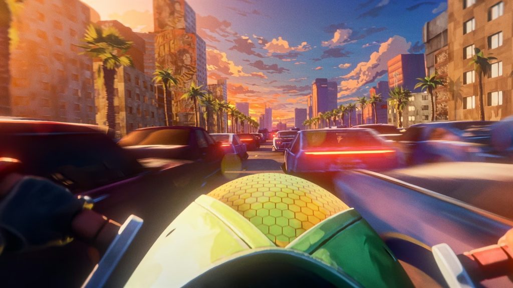 Hicimos una lluvia de ideas sobre cómo adaptar esta estructura a una historia y ahí fue cuando todo encajó. Nuestro director creativo, Kurtis Theorin, lleva varios años desarrollando una serie basada en un conductor de viajes compartidos, un apasionado de la adrenalina, que vive en el futuro cercano de “Neo-California”. Con arte conceptual, vehículos, personajes y un par de modelos 3D para empezar, simplemente cambiamos a nuestro conductor de viajes compartidos por un repartidor de comida obsesionado con la velocidad (una industria que prioriza la velocidad por encima de todo) ¡y nos lanzamos a la aventura!