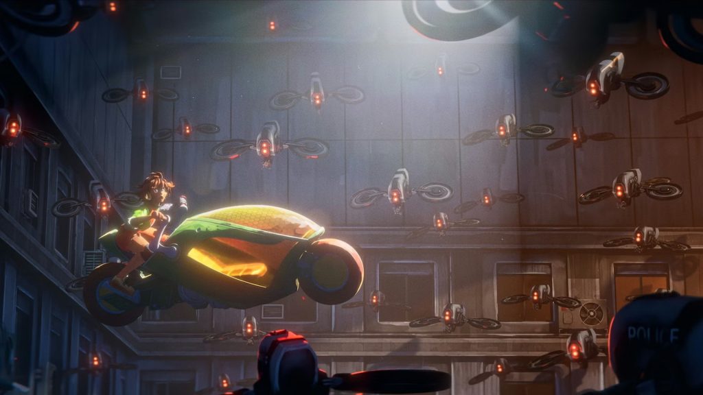Theorin: La mayoría de nuestros cortometrajes anteriores dependían en gran medida de la tecnología de captura de movimiento para acelerar la animación. Sin embargo, en el caso de “Rush Order”, la captura de movimiento pasó a un segundo plano. Dado que la mayor parte de la película gira en torno a una persecución a alta velocidad, tuve que animar casi todo a mano. Por suerte, las escenas de persecución y la animación de vehículos pueden ser muy flexibles con suficiente velocidad y movimiento de cámara, pero eso no significa que esta fase no estuviera exenta de desafíos. Como estábamos limitados por la música que elegimos, tuvimos que comprimir partes del ritmo de la historia para que encajaran en ciertas secciones de la canción, lo que implicó contar con una cámara muy precisa y dinámica para mostrarlas. Se puede observar que la cámara a menudo se ve obligada a combinar dos puntos de la historia en una sola toma para contar una historia completa dentro del tiempo asignado. Esto requirió un cuidado especial con la animación de cámara y su integración con la animación de personajes.